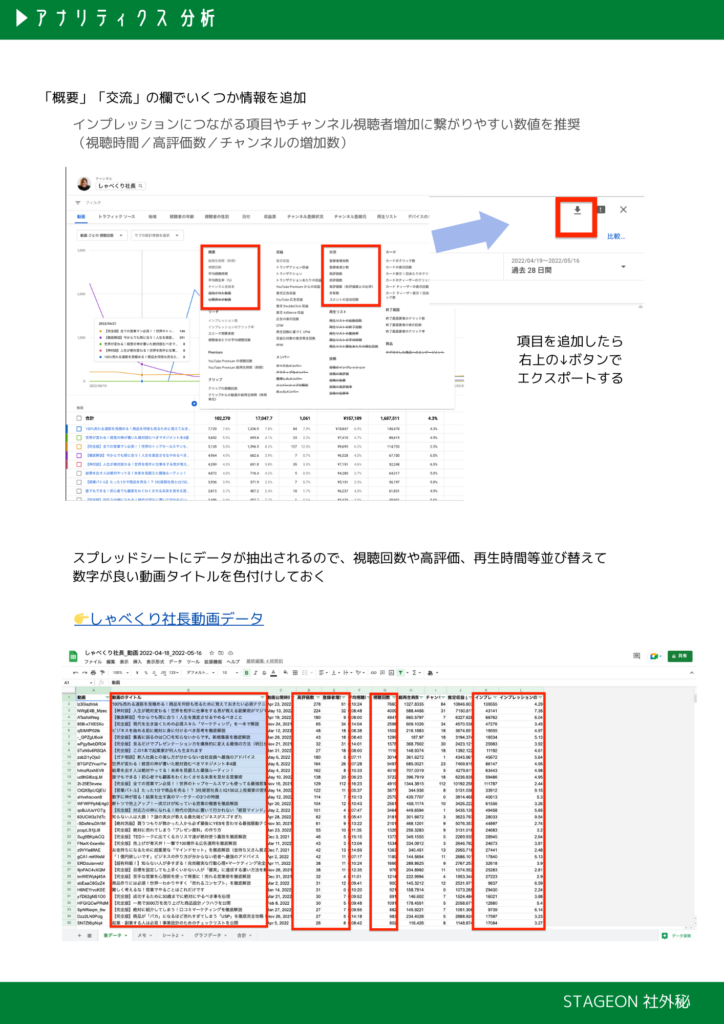 - YouTubeアナリティクスから得られる情報は各チャンネルの資産的情報であり、外部に流出させたり、指定されたクライアント以外に提示することは厳禁です。