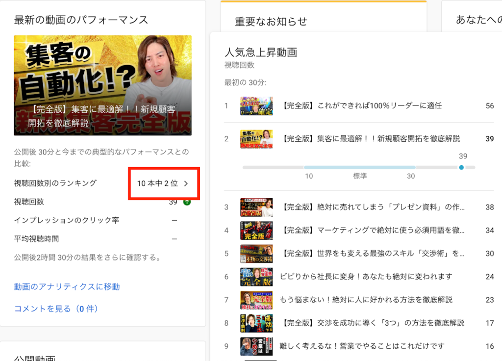 ダッシュボードを開くと、最新に公開した動画についてのYouTubeからのコメントと、過去10動画を比較した順位が記載されています。