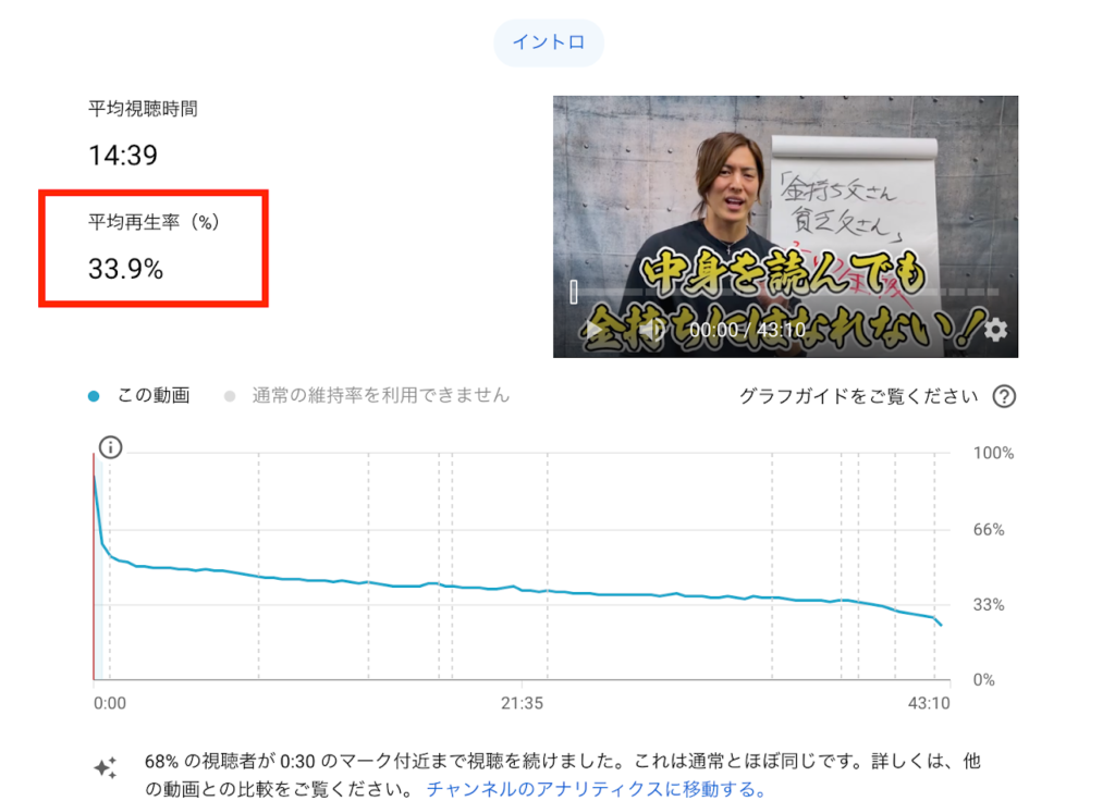 視聴ごとに動画全体の何%が見られているかの平均値を示しています。視聴者が動画のどの部分に関心が高いのかを分析するときなどにも使いましょう。