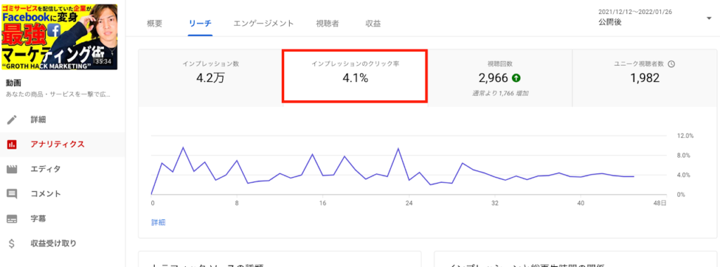 原則、8%以上を目指します。8%以下の場合は サムネ・タイトルを変更するなど早急に対応してください。