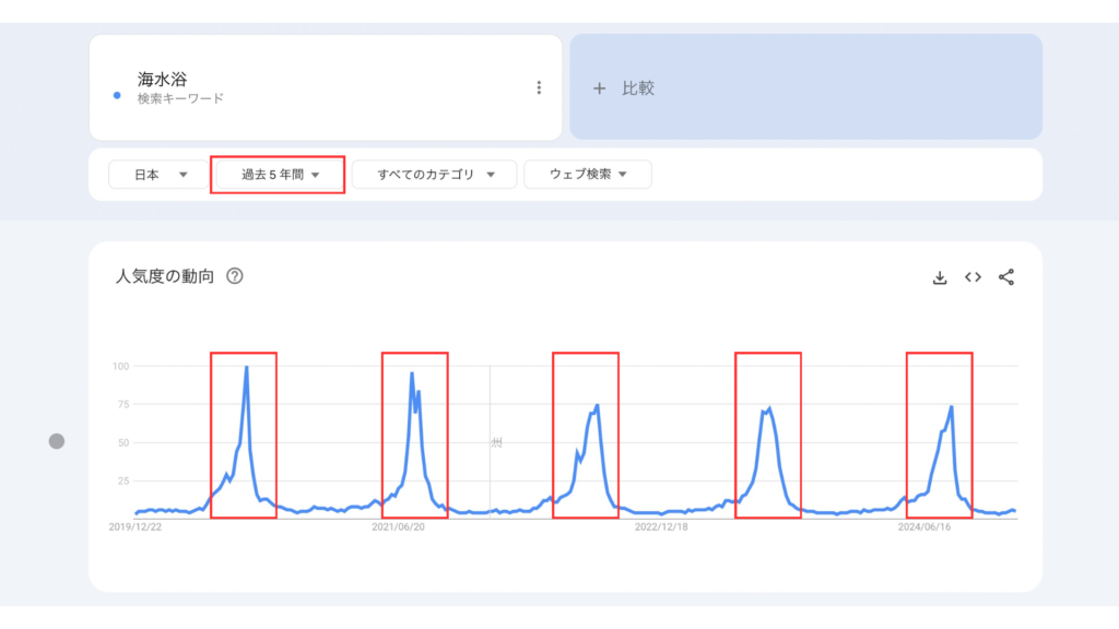 Googleトレンドで検索期間を「過去5年」に設定して調査すると、これらのキーワードが毎年7月後半から8月前半にかけて検索ボリュームが増加していることが確認できます。