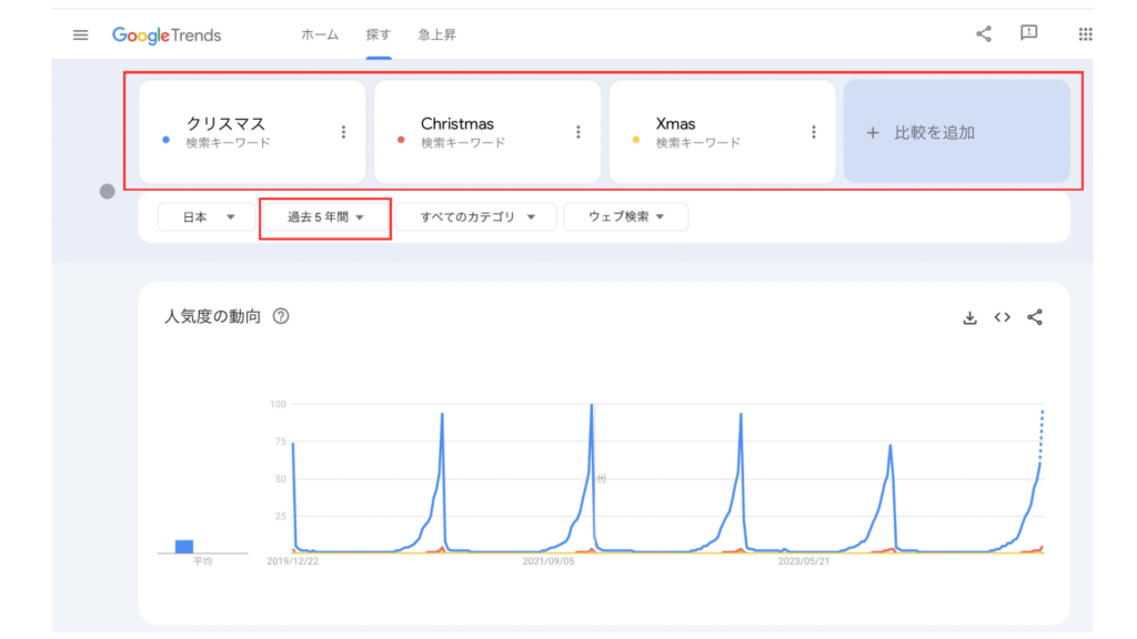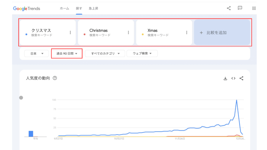 「クリスマス」というテーマで、カタカナの「クリスマス」、略語の「Xmas」、英語の「Christmas」を比較する際、Googleトレンドのキーワード比較機能を活用することで、どの表現がターゲット層に最も馴染みがあり、よく使われているかを分析できます。
