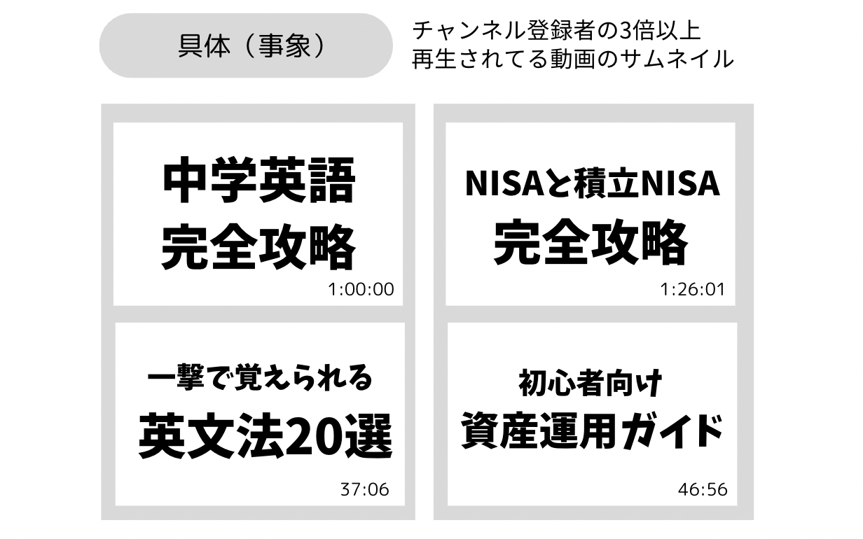具体(事象):「〇〇完全版」というサムネイル・タイトルで投稿された動画が各ジャンルで人気を博していることを観察します。これらの動画は、特定のトピックに関して包括的かつ詳細な情報を提供し、視聴者がそのトピックについて深く理解できるように設計されています。