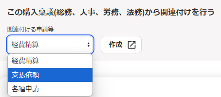 画面上部「この購入稟議から関連付けを行う」より支払依頼を選択し、作成を押下します。