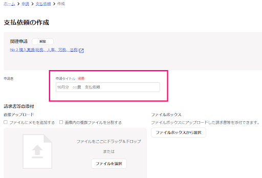 申請タイトルの「○○費」部分を適する内容に変更し、請求書や見積書がある場合のみ画像、PDFを添付してください。