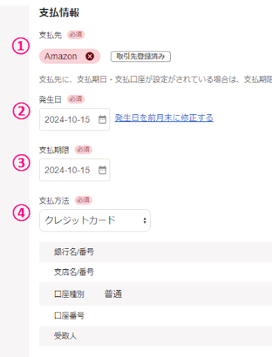 振込の場合は支払先口座情報の入力までお願いいたします。