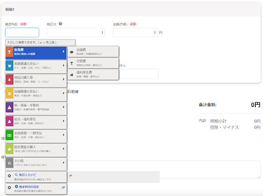 勘定科目・税区分・税込の金額・内容・部門を入力します。