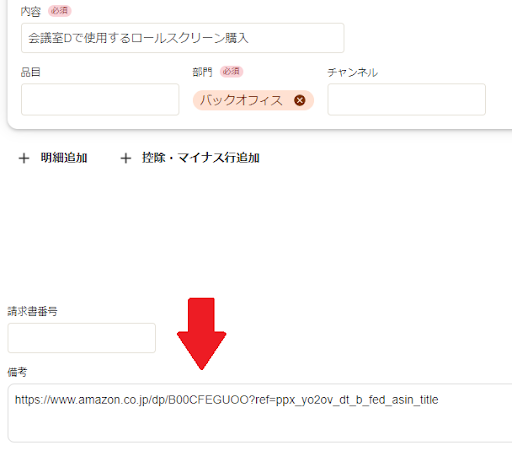 Amazon等、各サイトでの物品購入の際は備考欄に商品のURLを入力します。