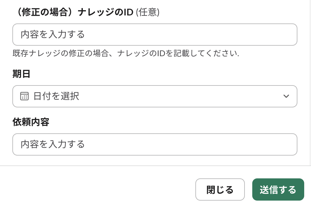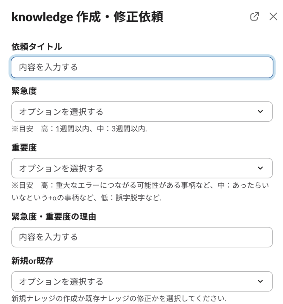 【 依頼フォーム記入項目 】依頼タイトル:ナレッジ作成もしくは修正の概要を簡潔に記載してください。